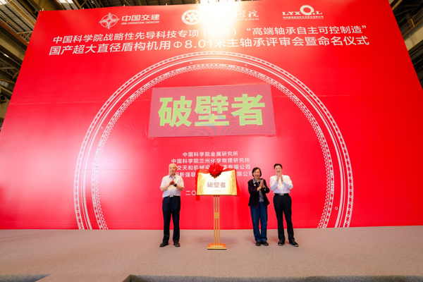 在中國科學(xué)院戰(zhàn)略性先導(dǎo)科技專項“高端軸承自主可控制造”支持下,由中國科學(xué)院金屬研究所牽頭,聯(lián)合中國交通建設(shè)集團有限公司的中交天和機械設(shè)備制造有限公司、洛陽新強聯(lián)回轉(zhuǎn)支承股份有限公司等國內(nèi)二十余家優(yōu)勢單位,研制的直徑8.01米主軸承近日在江蘇常熟通過專家組評審,并被正式命名為“破壁者”。中國科學(xué)院重大任務(wù)局何京東處長、綜合規(guī)劃局白雪瑞副處長,金屬所李依依院士、陳星秋副所長、科技處黃糧處長、專項首席專家李殿中研究員、技術(shù)總師胡小強研究員等相關(guān)領(lǐng)導(dǎo)和科研人員出席評審會暨命名儀式。