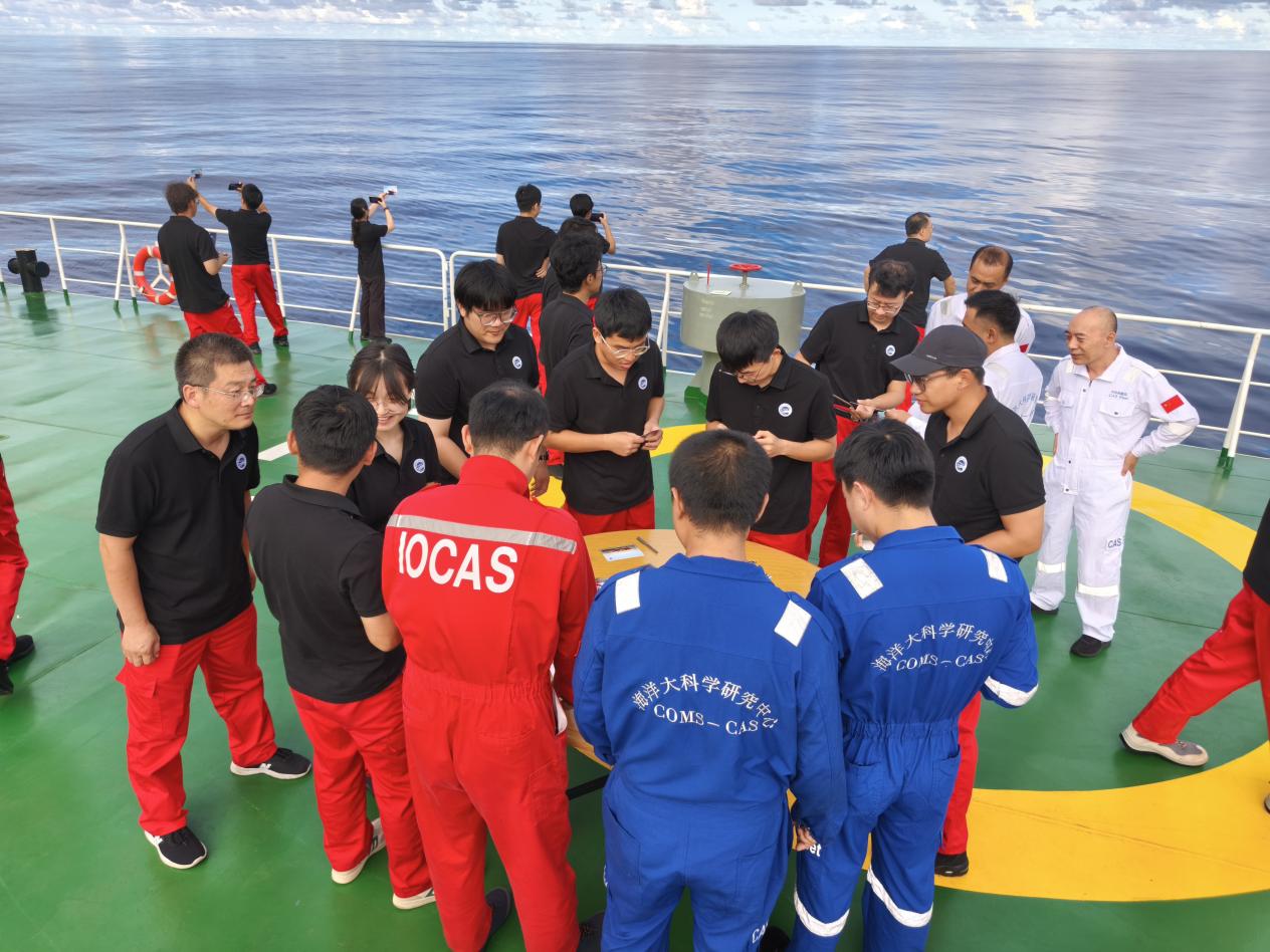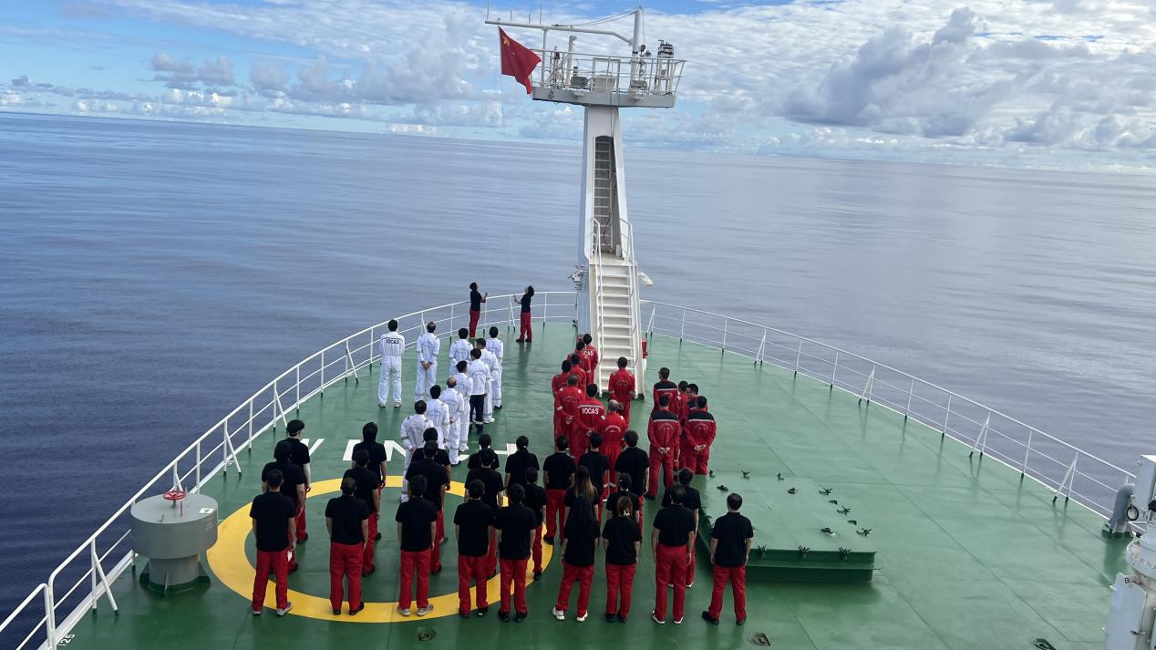 清晨6時,“科學”輪全體船隊員身著工作服整齊列隊,黨員同志佩戴黨員徽章,在甲板上組成“76”字樣的方陣,致敬新中國成立76周年。當國旗升至桿頂?shù)乃查g,全體船隊員莊嚴宣誓:“以科學之名探索深海,以忠誠之心守護海疆!”這是對祖國的莊嚴承諾,更是新時代海洋科技工作者的使命宣言。儀式結(jié)束后,大家紛紛表示:“每一次設備下潛、每一份樣本數(shù)據(jù),都是對國家海洋強國戰(zhàn)略的具體踐行。