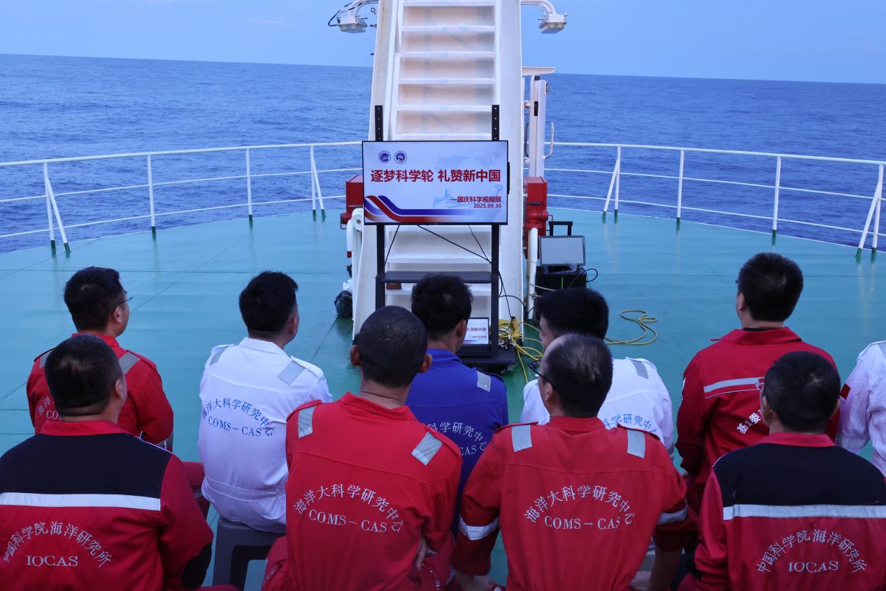 傍晚7時,前甲板的大屏幕亮起,大家席地而坐,觀看“科學輪成果巡展視頻”。自2014年首航跨赤道布放潛標、2016年發(fā)現(xiàn)超臨界二氧化碳流體、2018年獲取中部型厄爾尼諾全水深數(shù)據(jù),2020年在深海冷泉區(qū)發(fā)現(xiàn)新型硫氧化微生物……一系列標志性成果生動展現(xiàn)了“科學”號在探索海洋科學道路上的堅實步伐。夜幕降臨,甲板上國旗迎風飄揚,白天寫下的祝福仍在心間回蕩,與視頻余韻交織成一曲深情的海上禮贊。