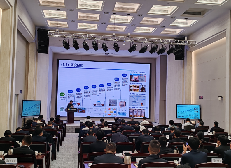 專題報告和研討交流環(huán)節(jié),德滬涂膜集團創(chuàng)始人、董事長王錦山,南京大學教授、博導(dǎo),仁爍光能創(chuàng)始人、董事長譚海仁,四川大學教授趙德威,太陽能光電轉(zhuǎn)化與利用全國重點實驗室副主任逄淑平,極電光能聯(lián)合創(chuàng)始人、副總裁鄭策,山東能源集團鈣鈦礦項目負責人姜京福分別圍繞鈣鈦礦電池產(chǎn)業(yè)化過程中的挑戰(zhàn)與對策、鈣鈦礦電池在穩(wěn)定性方面存在的問題及解決方法、鈣鈦礦及四端疊層電池產(chǎn)業(yè)化現(xiàn)狀與展望、鈣鈦礦如何成為下一代主流光伏技術(shù)、單結(jié)及疊層組件研究進展及產(chǎn)業(yè)化前景、百兆瓦產(chǎn)線建設(shè)進展情況等方面做了詳細闡述,為鈣鈦礦產(chǎn)業(yè)化高質(zhì)量發(fā)展提供了先進的實踐經(jīng)驗、未來研究方向以及發(fā)展思路。